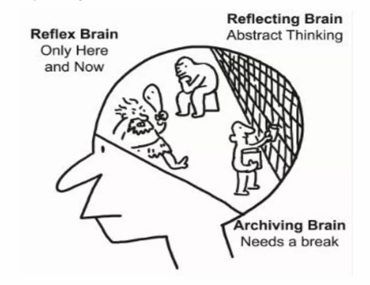 - The reflex brain – This is the primitive part of the brain. Ultra-fast in hyper-connection situations. In a reactive mode, it will be the first to respond to the detriment of the reflective brain.